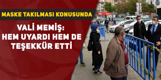 Maske takan kurum memurlarına ve vatandaşlara teşekkür eden Vali Memiş,“Sosyal mesafeyi koruyup, mutlaka maske takacağız ve hijyene dikkat edeceğiz. Bu şekilde davrandığımız sürece inşallah bu zorlu süreci zarar görmeden kısa bir sürede atlatmış olacağız” dedi.