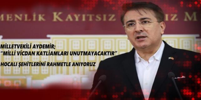 Karabağ Zaferiyle Hocalı katillerine tarihi bir ders verildiği, Türk Milletine zulmü reva görenlerin hakir ve zelil düştüğünü ifade eden Milletvekili Aydemir, ‘Azerbaycanlı kardeşlerimizin acısını bir kez daha paylaşıyor, şehitlerimizi rahmet, saygı ve şükranla anıyoruz. Zulmü alkışlamayan, zalimi asla sevmeyen Yüce bir Milletin evladı olarak şühedamızın hatıralarını daim diri ve aziz tutacağız.‘ dedi.