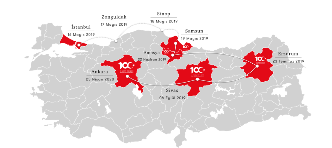 Buna göre, 100. yıl kutlamalarına ilişkin etkinlikler yıl boyunca İstanbul, Samsun, Amasya, Erzurum, Sivas ve Ankara güzergahı başta olmak üzere tüm Türkiye’de gerçekleştirilecek.