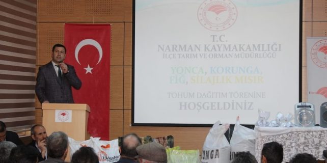 Narman İlçe Tarım ve Orman Müdürü Erhan Çiftgül ise konuşmasında “İl Tarım ve Orman Müdürlüğü tarafından hazırlanan ve Erzurum Valiliği Yatırım İzleme ve Koordinasyon Başkanlığı ile finansmanı sağlanan ‘Yem Bitkileri Yetiştiriciliğinin Yaygınlaştırılma Projesi’ kapsamında ilçemizde 4 ton Yonca, 3 ton Korunga, 3 ton Fiğ, ve 50 torba Silajlık Mısır tohumu tahsis edilmiştir. Böylece ilçede yapılan çalışmalar ile yem bitkisi üretiminin arttırılarak kaliteli kaba yem ihtiyacının karşılanması ve verimin arttırılması hedeflenmiştir. Dağıttığımız bu tohumlarla üreticilerimizin kaliteli ve bol ürün elde etmelerini temenni ediyor, hayırlı olmasını diliyorum.” diye konuştu.