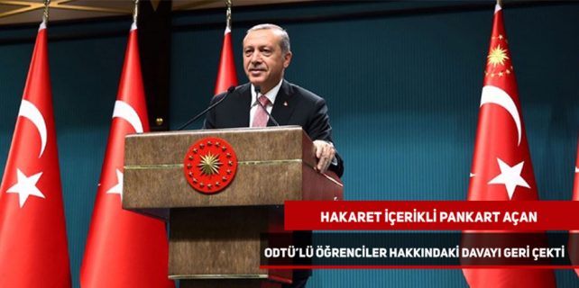 Cumhurbaşkanı Erdoğan, ODTÜ mezuniyet töreninde kendisine hakaret içeren pankart taşımalarının ardından haklarında dava açılan 4 öğrenci ile dün görüşmüş, öğrenciler hakkında açılan davanın geri çekilmesi için talimat vereceği öğrenilmişti. Erdoğan’ın avukatı Hüseyin Aydın, söz konusu davayı geri çekme dilekçesini mahkemeye sundu. Dilekçede, “Atılı suçtan dolayı yapılan soruşturma sürecinde sanıkların eylem nedeniyle üzüntü ve özür içeren beyanları, sanıkların genç ve öğrenci oluşları da dikkate alınarak Cumhurbaşkanımız tarafından sanıklarla ilgili vaki şikayetimizden feragat edilmesi talimatı verilmiştir. Cumhurbaşkanımız, gençlerimizin siyasetle ve ülke sorunlarıyla ilgilenmelerinden büyük memnuniyet duymakta ve gençlerimize güvenmektedir. Bu çerçevede başta seçilme yaşının 18 yaşına düşürülmesi de dahil olmak üzere gençlerimizin ülke yönetimine katılımı hususunda Cumhurbaşkanımızın liderliğinde yapılan reformlar milletimizin bilgisi dahilindedir. Ancak gençlerimizin düşüncelerini ifade ederken bir kısım marjinal gruplara ve sorumsuz siyasetçilere özenerek hakarete tevessül etmesi, Cumhurbaşkanımızın tasvip edebileceği bir hal tarzı değildir” denildi. Dilekçenin devamında şunlar kaydedildi: