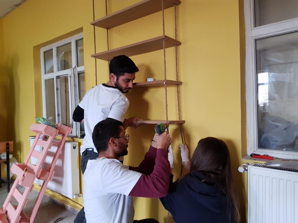 Gönüllüler, köy okulunda okuyan çocuklar için okuma kitabı desteği dışında kütüphanenin bulunduğu binayı boyayıp çeşitli hayvan figürleriyle renklendirdiler, okulu iç-dış tamamen onarıp kütüphane haline getirdiler.