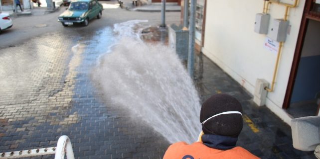 Oltu Belediyesi ekipleri bir yandan şebeke suyundaki arızaları yaparken bir yandan cadde ve sokakları dezenfekte ediyor. Su tankerine doldurulan dezenfekteli suyu caddelere yol kenarında duran araçlar da dahil olmaz üzere yıkadı.