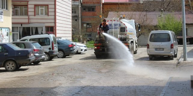 Oltu Belediyesi Temizlik ekipleri sokağa çıkma yasağından faydalanarak Oltu’nun caddelerini yıkadı.