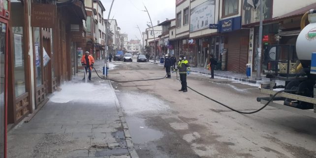 Pasinler Belediyesi tarafından ilçe merkezinde cadde ve kaldırımlar dezenfekte edilerek köpüklü suyla yıkandı.