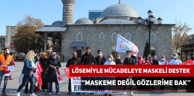 LÖSEV Erzurum Temsilcisi Fadim Ayaz ve Lösemili çocukların aileleri Lala Paşa Camisi önünde toplanarak ellerinde pankartlarla birlikte “Maskeme Değil Gözlerime Bak” sloganlarıyla Havuzbaşı Kent Meydanına kadar yürüdü.