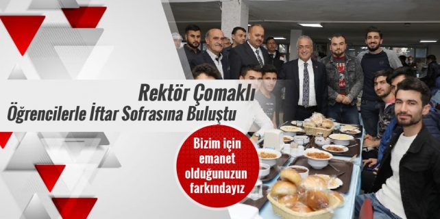 Merkezi yemekhane ile önünde kurulan iftar çadırını ziyaret eden ve iftar saatine kadar öğrencilerle sohbet eden Rektör Çomaklı, öğrencilerin sorunlarını, görüş ve isteklerini dinledi. Yapılan her hizmetin öğrenciler için gerçekleştiğini belirten Çomaklı, ezanın okunmasıyla birlikte iftarını öğrencilerle birlikte açtı.