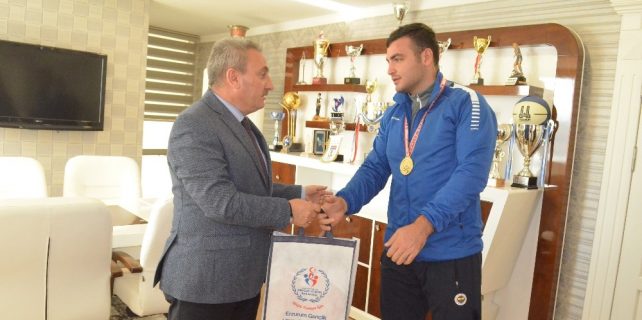Erzurum Gençlik ve Spor İl Müdürü Fuat Taşkesenligil, Türkiye şampiyonu boksör Muhammet Aydın ile üçüncü olan Yusuf Yılmaz’ı kutladı. Şampiyon boksörleri ödüllendiren Taşkesenligil, sporda gelen başarıların kendilerini gururlandırdığını söyledi.