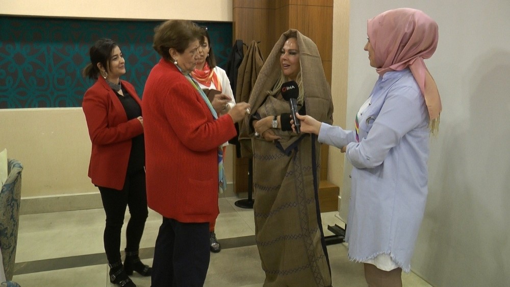 Erzurum Girişimci Kadılar Derneği Başkanı Zekiye Çomaklı, Erzurum’a gelen Safiye Soyman’a ehram hediye etti. Ehramın nasıl bir özelliği olduğunu merak eden Soyman Zekiye Çomaklı’dan Ehram hakkında bilgi aldı.