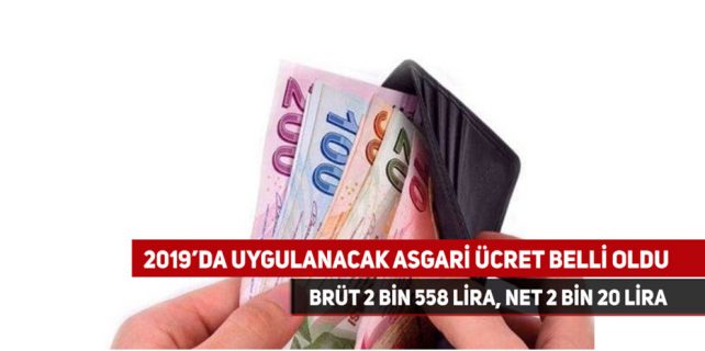 Milyonlarca vatandaşı ilgilendiren 2019 yılı asgari ücret tutarı belli oldu. Asgari Ücret Tespit Komisyonu 4. Toplantısı sonrası konuşan Bakan Zehra Zümrü Selçuk, “1 Ocak 2019 tarihinden itibaren geçerli olacak asgari ücret; brüt olarak 2 bin 558 TL lira, net olarak 2 bin 20 TL olarak belirlenmiştir.” dedi.