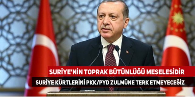 Beştepe’de konuşan Cumhurbaşkanı Erdoğan, Suriye’deki gelişmelere değindi. Erdoğan, “Suriye Araplarını DEAŞ’ın eline bırakmadığımız gibi Suriye Kürtlerini de PKK/PYD zulmüne terk etmeyeceğiz” dedi.