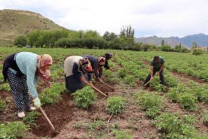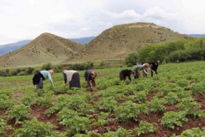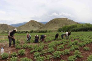 Erzurum Oltu’da patates tarlasında çapa yapan aileler çalışmayı eğlenceye çeviriyorlar. Patatesleri çapa yaparken yöresel çevirmeli türkü söyleyip stres atarak patates fidelerini kötü otlardan arındırıyorlar.