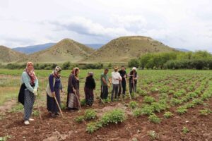 Çapa yapan Ayşe Özer, “Bugün biz tarlaya çapa yapmaya geldik eski günleri hatırladık evlerde bayanlarımız oturup bizi izliyorlar biliyorum ana bu işleri yapmalarını istiyorum tarla bahçe işlerini yapmalarını istiyorum hem evlerine katkıda bulunurlar hem de stres atıyoruz. Bayanlara sesleniyorum evde oturup dizi izlemeyin tarlalara yönelin topraklara yönelin eski günlerimize yönelelim faydamız olsun çoluğumuza çocuğumuza işimizi türküyle şarkıyla yapıyoruz zevkle yapıyoruz. Bu işleri herkesi davet ediyorum bu işleri yapsınlar hayat pahalılığı var çiftçiliğe dönsünler” dedi.