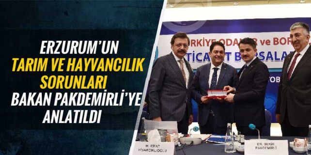 TÜRKİYE ODALAR VE BORSALAR BİRLİĞİ (TOBB)‘NİN DÜN GERÇEKLEŞEN BORSALAR KONSEY TOPLANTISINA, TARIM VE ORMAN BAKANI DR. BEKİR PAKDEMİRLİ’DE KATILDI. PROGRAMDA, ERZURUM TİCARET BORSASI YÖNETİM KURULU BAŞKANI VE BORSALAR KONSEYİ ÜYESİ HAKAN ORAL, ERZURUM’UN TARIM VE HAYVANCILIK SORUNLARINI BAKAN PAKDEMİRLİ’YE ANLATTI.