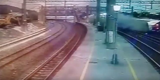 Görüntüde hızla istasyona gelen trenin raydan çıktığı, direkleri yıktığı ve vagonların devrildiği görülüyor. Kazayla ilgili soruşturmaysa sürüyor.