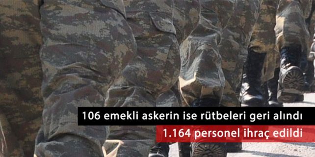 Türk Silahlı Kuvvetlerinden bugüne kadar bin 164 personel ihraç edilirken, 106 emekli askerin ise rütbeleri geri alındı.