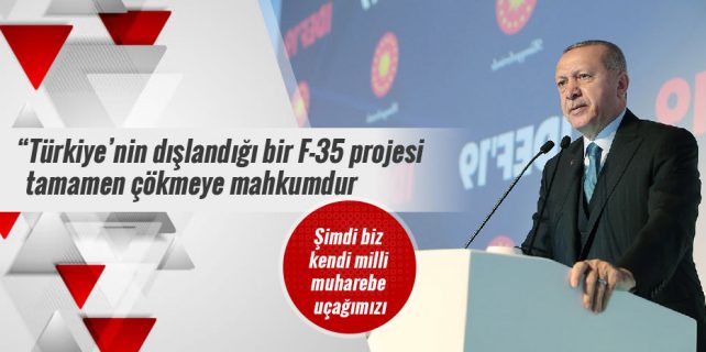 Cumhurbaşkanı Recep Tayyip Erdoğan Türkiye’nin F-35 konusunda haksızlığa ve dayatmaya maruz bırakıldığını belirterek, “Türkiye’nin dışlandığı bir F 35 projesi tamamen çökmeye mahkumdur. Şimdi biz kendi milli muharebe uçağımızı üretecek adımları da hızla atmaya başladık” dedi.