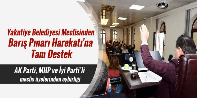 Yakutiye Belediyesi Meclisi Suriye’de terör örgütü PKK-PYD ve DEAŞ’a yönelik yürütülen Barış Pınarı Harekatı’na Destek için Belediye Başkanı Dr. Mahmut Uçar’ın başkanlığında olağanüstü toplandı. Yakutiye Belediye Meclisi, Barış Pınarı Harekatı’na oybirliğiyle destek verdi.