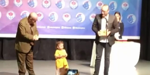 TRABZON’DA DÜZENLENEN DİREKLERARASI SEYİRCİ ÖDÜL TÖRENİNDE ERZURUMLU YÖNETMEN EMRAH ÇILGI ÖDÜL ALDIĞI SIRADA 2 YAŞINDA Kİ KIZI RAVZA ÇILGI SAHNEYE ÇIKARAK BABASINI ALKIŞLADI. BU ANLARA ŞAHİT OLAN DAVETLİLER İSE MİNİK RAVZA’YA ALKIŞLA DESTEK VERDİLER.